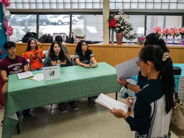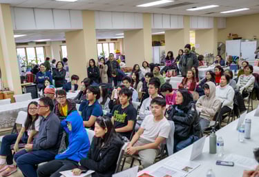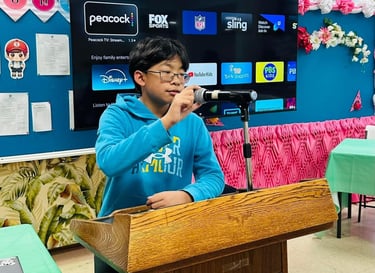 let's clap for our two brave volunteers! They are stepping up to the screen to play a fun vocabulary game about 'Places in Town'. Let's cheer them on and support them as they show their skills!